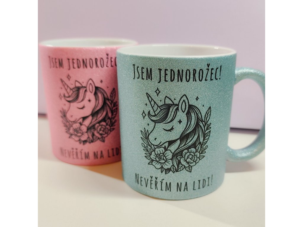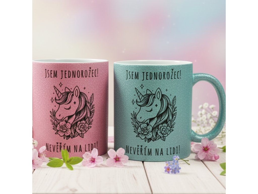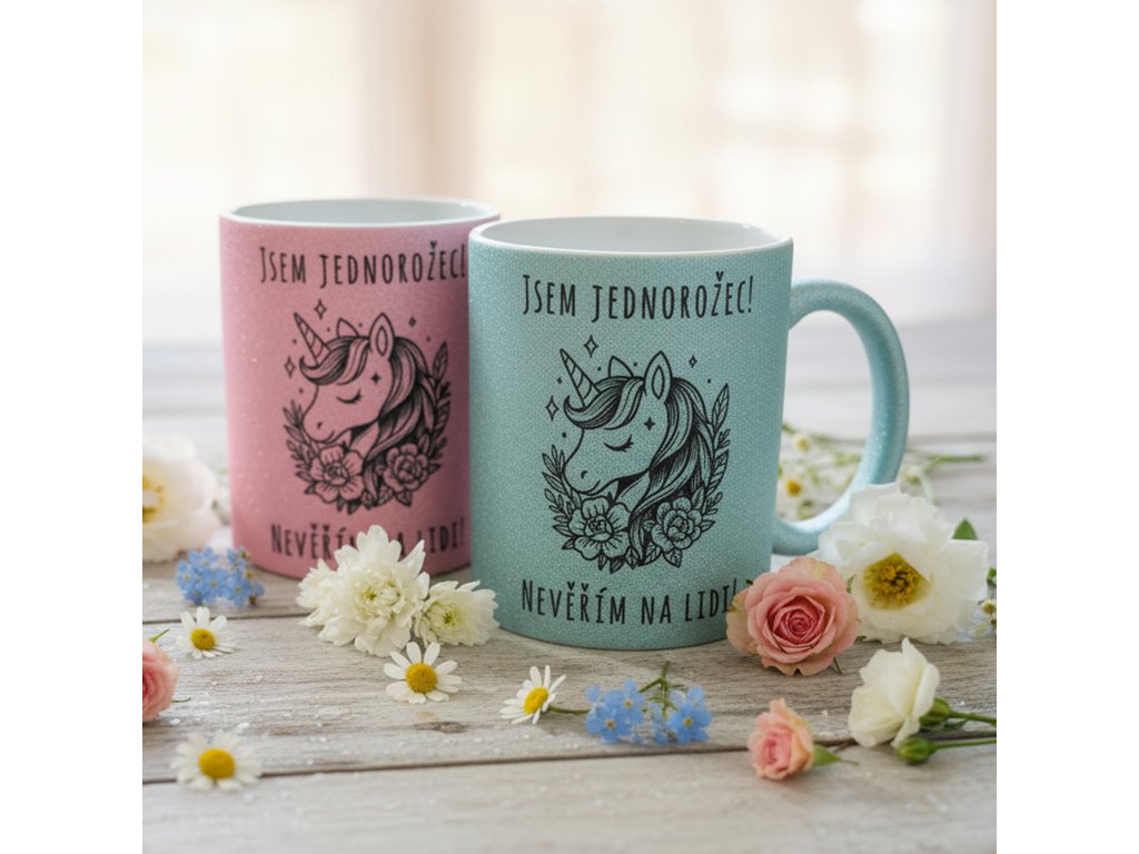 Hrnek, co má lesk jako blesk, pro všechny, kteří nevěří na lidi a raději si drží svůj magický odstup. Třpytivý keramický hrnek s autorskou kresbou jednorožce a nápisem „Jsem jednorožec, nevěřím na lidi“ – originál s užitným objemem 300 ml.